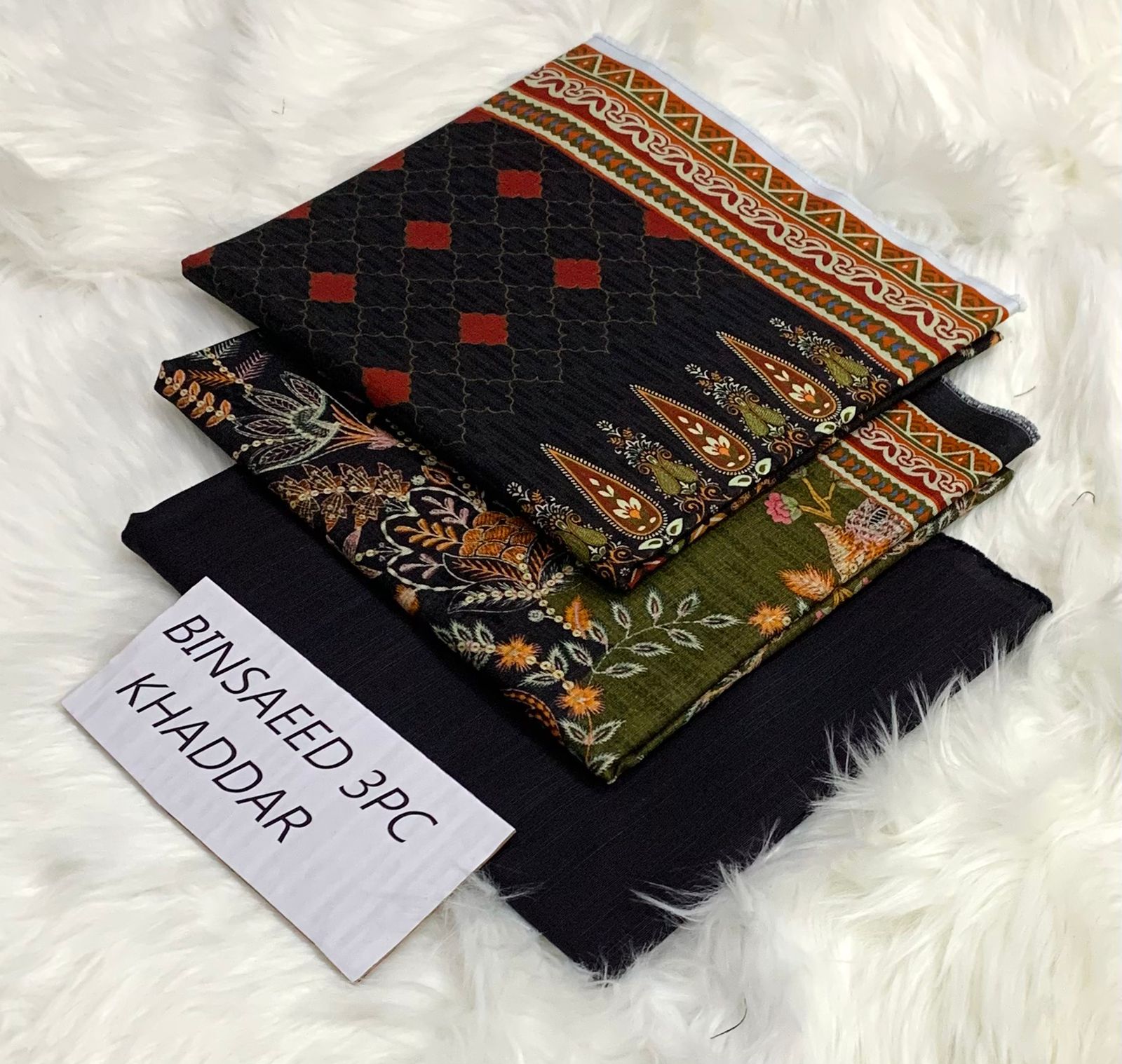 Bin Saeed Original Khaddar 3PC – Elegant Allover Print with Dyed Trouser & Premium Dupatta