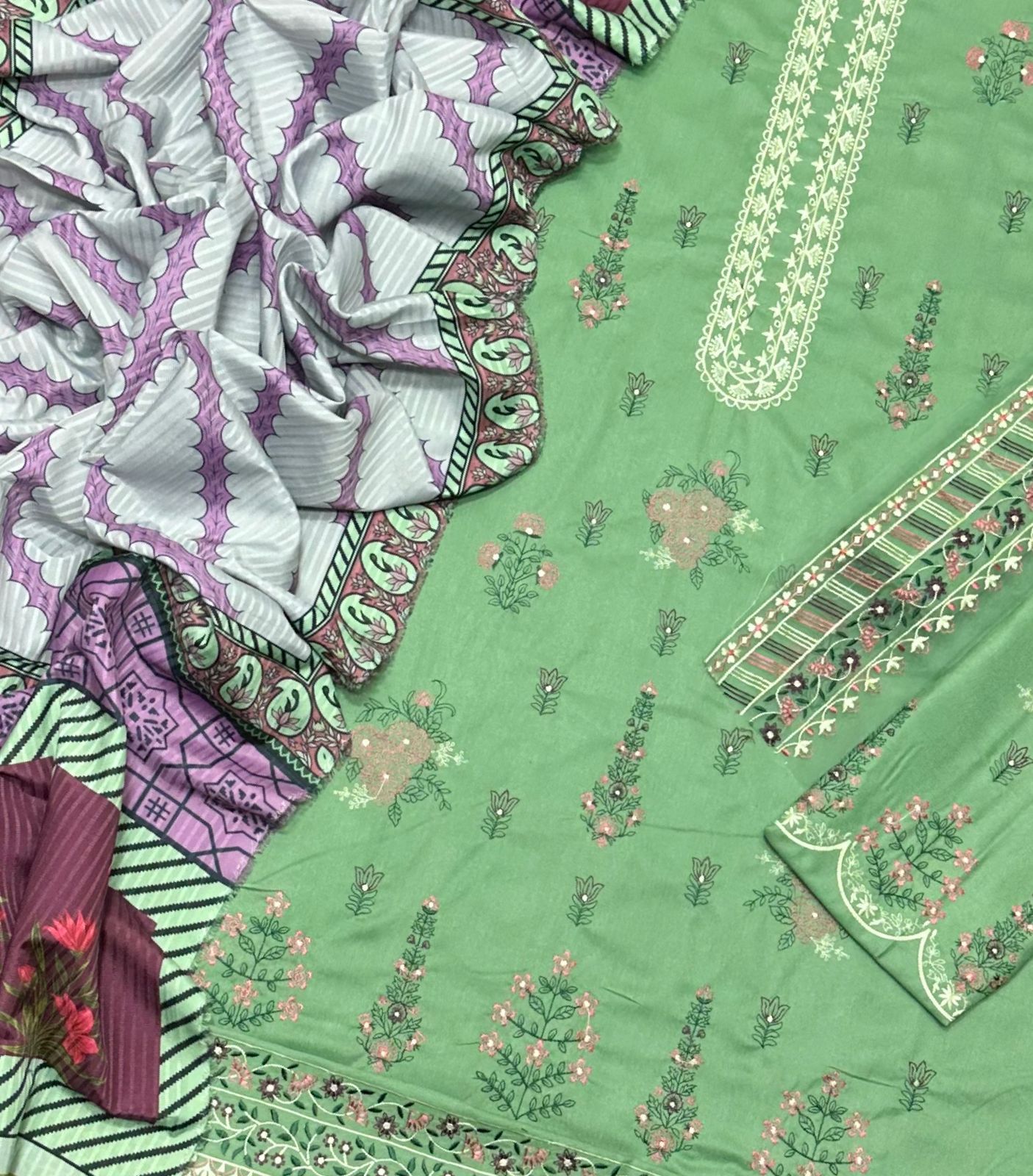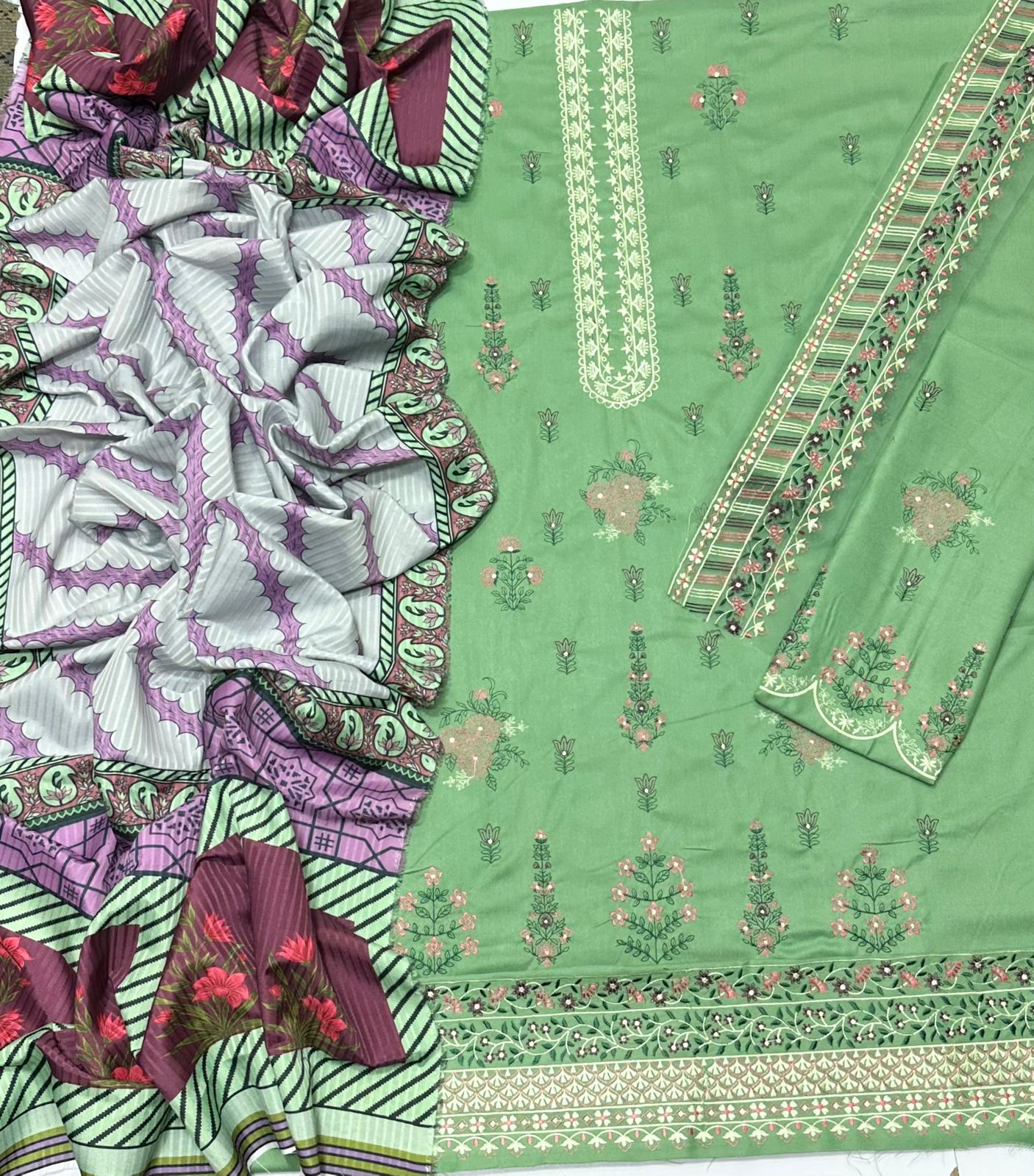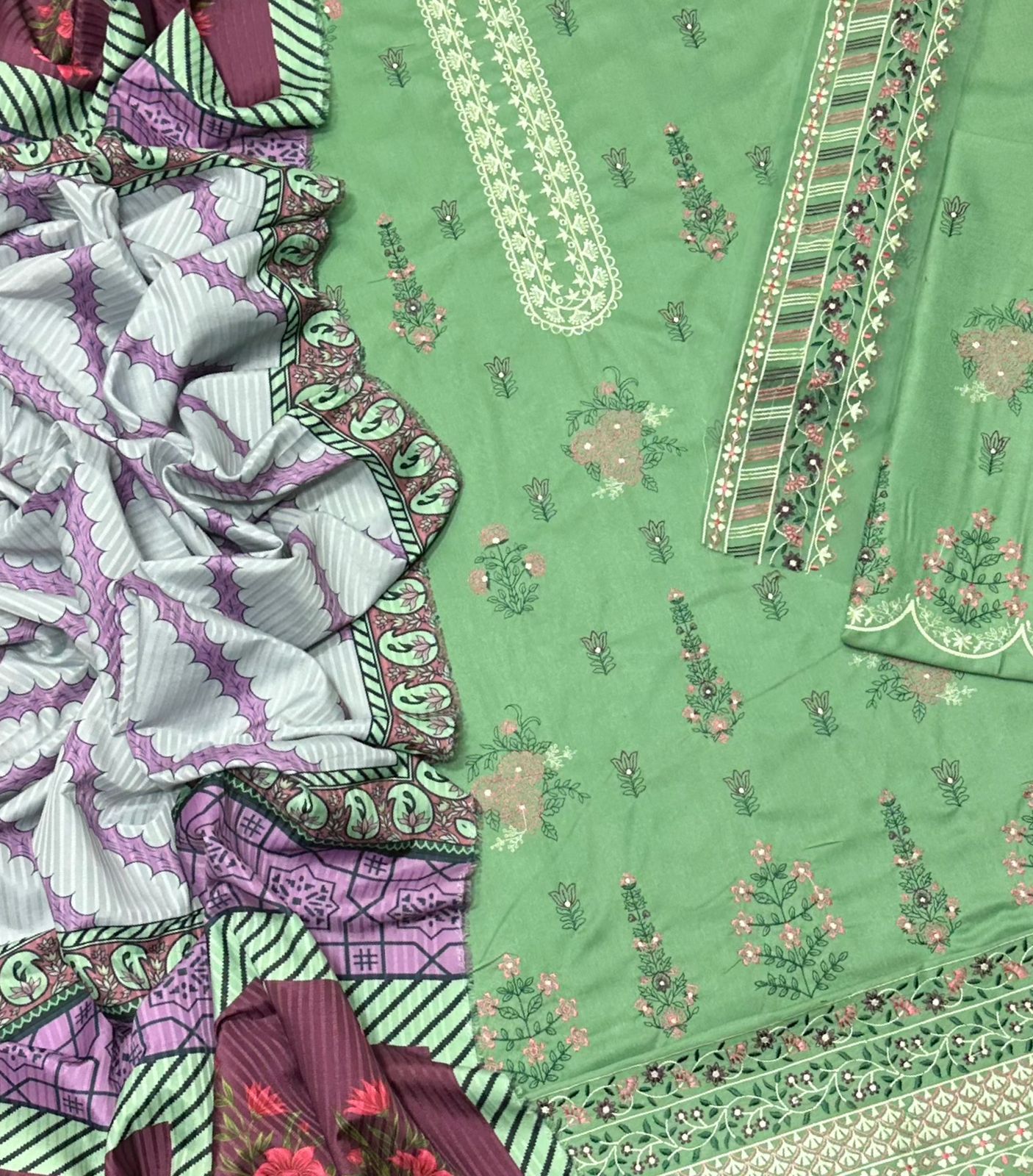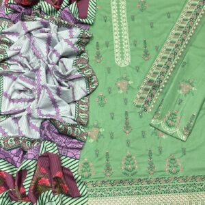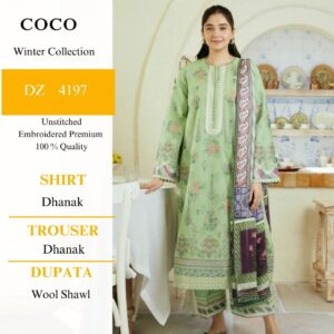 Upgrade your wardrobe with our exclusive Women’s Dhanak Fancy Party Wear Suit – designed for modern elegance and comfort. This 3-piece embroidered suit features: