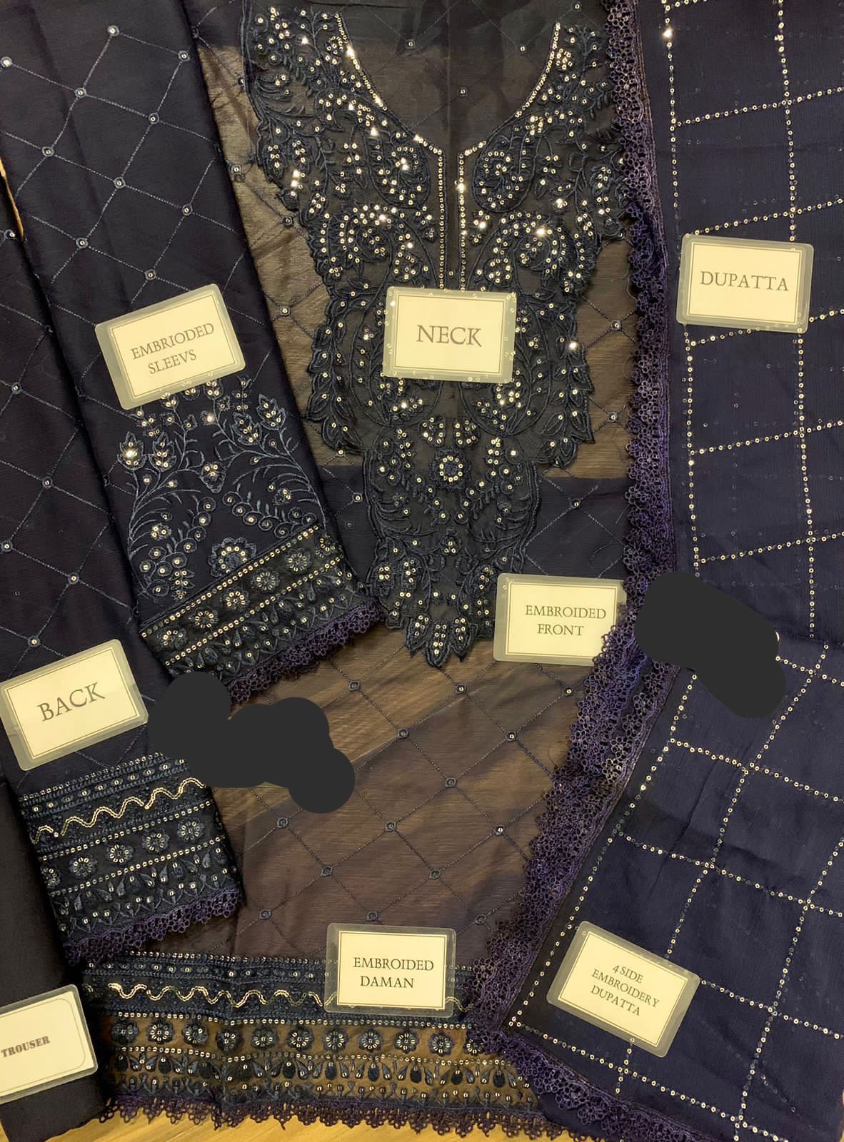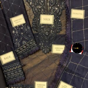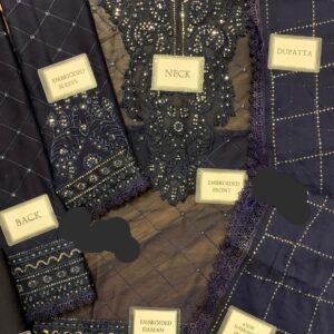 Chiffon Front: Fully heavy embroidered with spangle work + embroidered neckline + embroidered daman border with Schiffli lace attach
