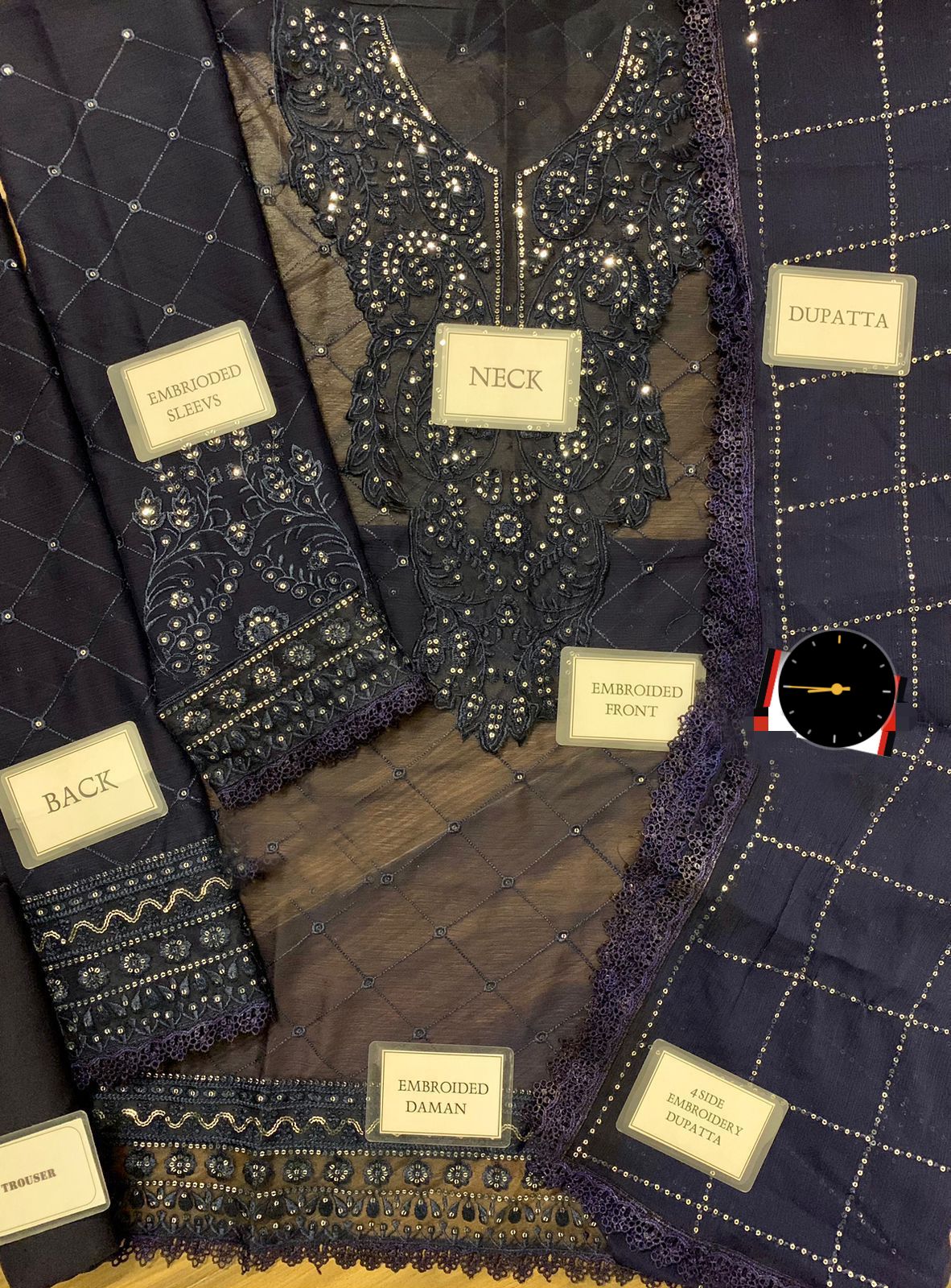 Chiffon Back: Fully heavy embroidered with spangle work + embroidered daman border with Schiffli lace attach