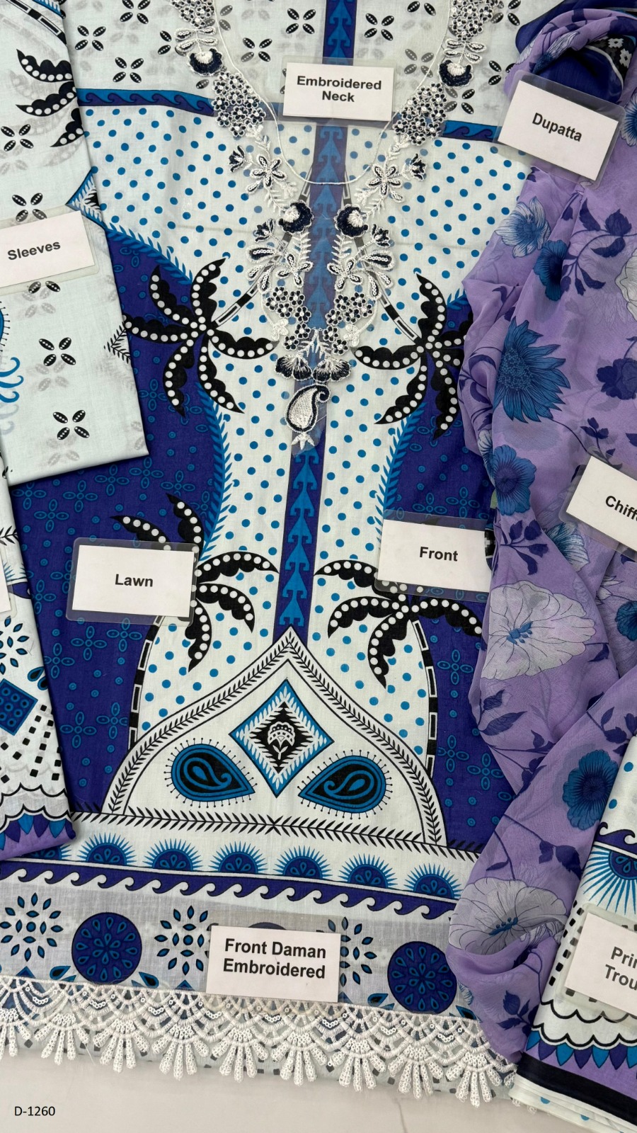 Front Printed Lawn enhanced with Daman Lace Embroidery — adds a delicate ornamental finish.